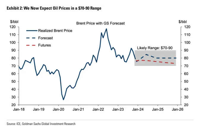 高盛预计,到2024年6月,布伦特原油价格将达到每桶85美元的峰值,然后在未来两年达到每桶81美元或80美元的平均水平,低于之前预测的每桶92美元。