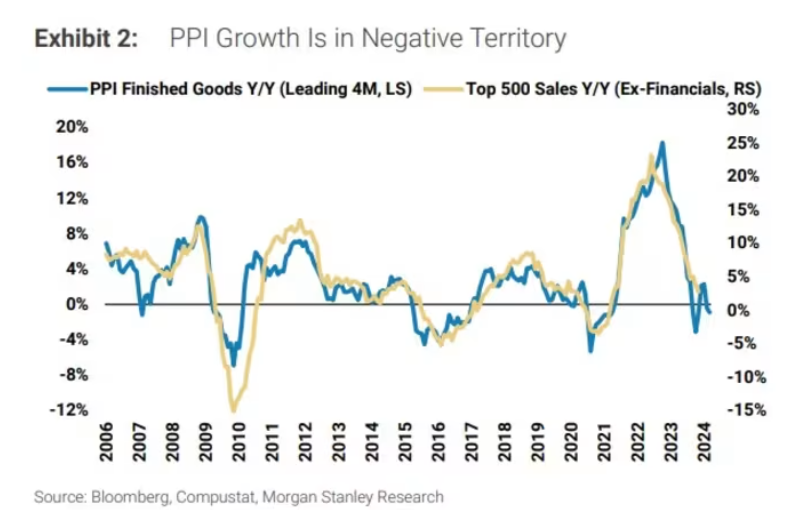 问题是价格可能下降太多——不是对消费者而言,而是对企业而言。以下这张摩根士丹利提供的图表表明,生产者价格指数(PPI) 中的商品成分往往会领先标普500指数成分股公司盈利增长约四个月,而最近的PPI数据表明,企业将很难实现任何利润增长。