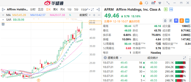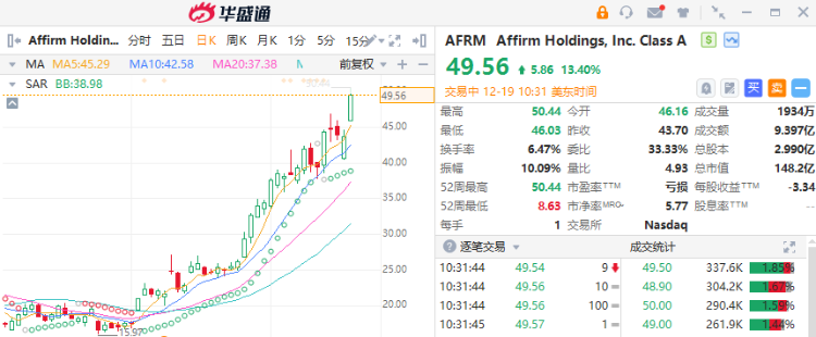 华盛资讯12月19日消息,Affirm Holdings $AFRM 涨超13%,报49.46美元。消息面上,宣布已与沃尔玛扩展服务合作。此外,摩根士丹利将Affirm Holdings的目标价从15美元上调至20美元。