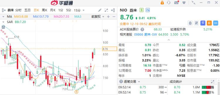 华盛资讯12月19日消息,蔚来盘初续涨超4%,最高触及8.78美元。消息面上,12月18日,蔚来宣布获得阿布扎比投资机构CYVN约22亿美元的战略投资。此外,李斌今日表示,仍然拥有蔚来最大投票权。