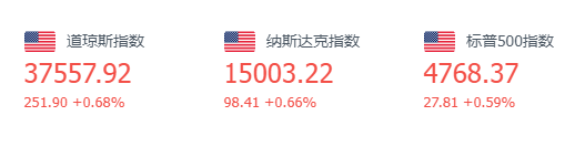 尽管美联储官员持续打压降息预期,但投资者乐观情绪不减,三大指数集体收涨,道指涨0.68%,纳指涨0.66%,自去年1月以来首次收于15000点上方,标普500指数涨0.59%。其中,纳指、道指均连涨九日,道指连续五日刷新历史新高,纳指、标普500指数均续创去年2月份以来新高。标普500指数距离历史收盘高点仅有0.6%的差距,距离盘中纪录高点还差1%,这两个纪录都是2022年1月创下的。