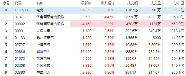 华盛资讯12月20日消息,截至发稿,华电国际电力股份涨超4%,华能国际电力股份涨超3%,大唐发电、上海电气、华润电力、东方电气等涨超2%,中国电力涨近2%。
