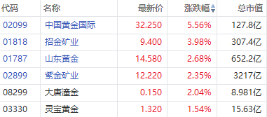 12月20日,黄金股早盘集体走高,截至发稿,中国黄金国际涨近6%,招金矿业涨近4%,山东黄金、紫金矿业、大唐潼金涨超2%,灵宝黄金涨超1%。