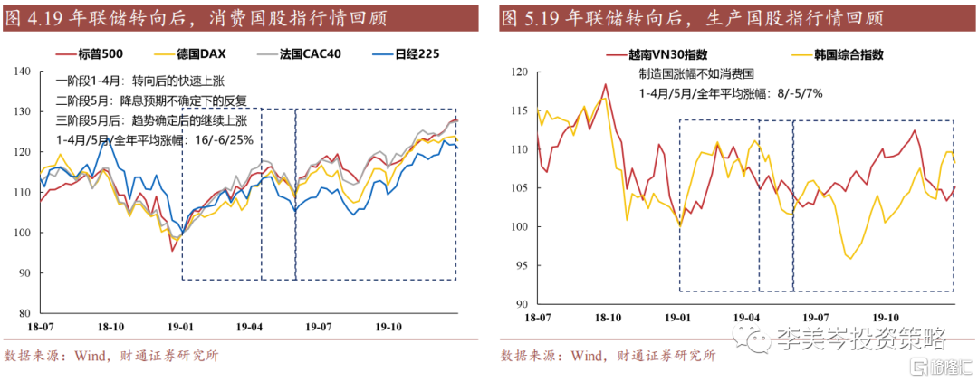对比2019年联储态度转向后的行情节奏:18年底市场感受到联储态度转变后,19年股市快速回升。具体经历3阶段:一阶段(1-4月)分母端压力大幅缓解,行情快速上升。二阶段(5月)市场防范不会快速降息,行情有所回落,三阶段(5月后)趋势明确后行情再起。结构看,消费国(美日欧)>制造国(韩越,中国当年经历外资大幅流入),本轮可能也是消费国(美国、欧洲、日本)先涨,制造国(中国、韩国、越南)再涨。