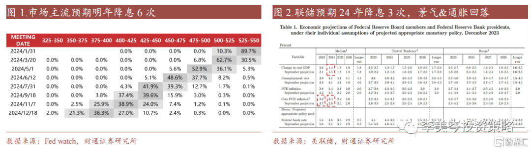 12月联储会议态度显著转向。联储12月如期不加息,但点阵图显示预计联储官员预计24年降息3次,较9月预期多降息2次,对降息态度转变明显。对景气和通胀判断回落或为快速转向主因。联储23年核心PCE预期从9月的3.7%降至3.2%,24年GDP/核心PCE预期从9月的1.5%/2.6%降至1.4%/2.4%。当前市场已预期24年3月开始降息,全年降息6次。