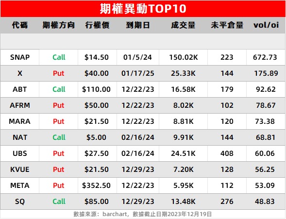 3、比特币矿商Marathon Digital $MARA 隔夜再涨10.51%,12月累涨83%;当日期权成交总量达60万张,较上一日增加21万张。其中看涨期权占比59.4%