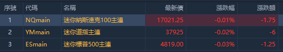 周三美股盘前,三大股指期货微跌,截至发稿,纳指期货 $NQmain 现跌0.01%,标普500指数期货 $ESmain 跌0.03%,道指期货 $YMmain 跌0.02%。