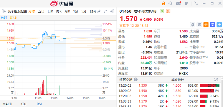 12月20日,交个朋友控股(01450)走高,截至发稿,涨6.08%,报1.57港元,成交额523.1万港元。