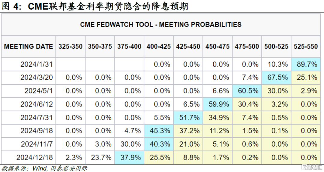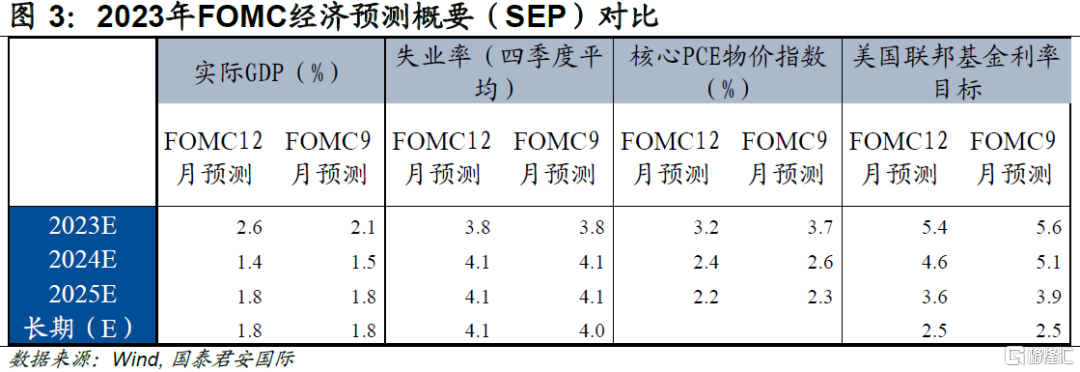 其一,债券市场定价全面转“鸽”,市场预期的降息节奏更快、幅度更高。12月点阵图以及鲍威尔讲话表明本轮加息周期终结,降息提上日程。美联储在经济预测概要(SEP)中进一步下修2024年美国经济增长的预期以及核心PCE,市场则相应上调对降息节奏和幅度的预期。一方面,美联储小幅下修经济增速,上修2023年经济增速,由9月预测的2.1%提升至2.6%,而小幅下修2024年美国经济增速,由1.5%调降至1.4%;另一方面,美联储12月在SEP中大幅下调核心PCE,2023年核心PCE由9月预测的3.7%调降至3.2%,2024年核心PCE则由2.6%调降至2.4%。市场降息预期进一步升温,根据芝商所(CME)期货隐含的降息预期,市场预期美联储降息周期从2024年3月开启,全年降息150BP,降息节奏更快、幅度更高。