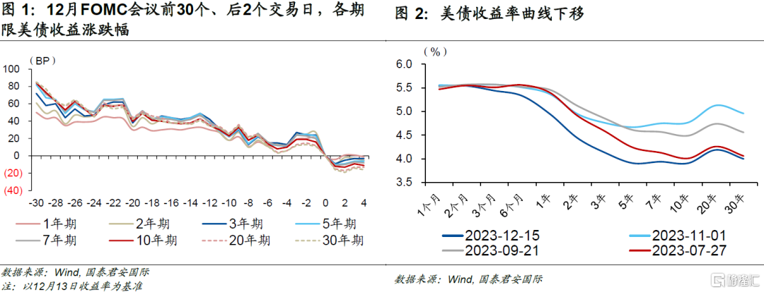 12月美联储FOMC会议前后,美债表现凶猛。12月美联储FOMC会议(12月14日)前,市场交易降息预期“抢跑”美联储货币政策立场转向。FOMC会议前30个交易日(2023年10月31日)以来的各期限美债利率均明显下行,美债收益率曲线进一步下移。其中3M、2Y、5Y、10Y以及20Y美债分别累计下降14BP、58BP、77BP、85BP、92BP,长端美债交易表现更加“亢奋”。