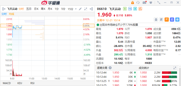 12月21日,飞天云动(06610)逆市走强,截至发稿,涨5.95%,报1.96港元,成交额1664万港元。