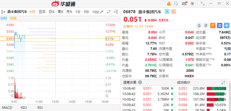 12月21日,鼎丰集团汽车(06878)昨日一度跌超16%,截至发稿,涨8.51%,报0.051港元,成交额3975万港元。