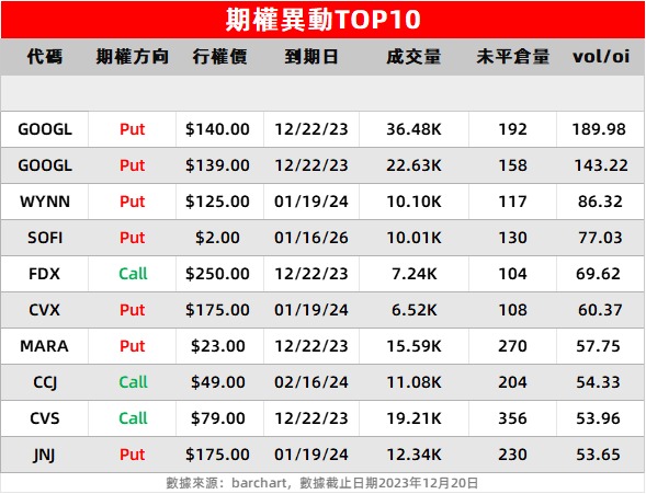 2、谷歌A隔夜涨1.24%,当日期权成交总量达66万张,较上一日增加38万张,放量超1.36倍,其中看涨期权占比68.3%。最显著的增加出现在2024年3月15日到期的期权上,增加了24586涨。