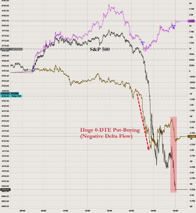 据SpotGamma提供的以下图表,从观察0DTE期权的delta变化可以看出,Emini期权在下午2:30准确地陷入了看跌期权陷阱,进而拖累了其他所有东西的下跌。