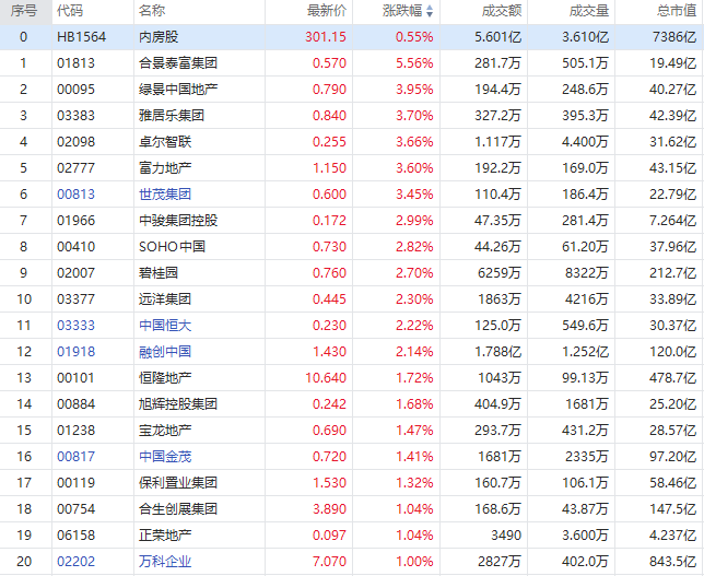 内房股方面,合景泰富集团涨超5%,富力地产、世茂集团涨超3%,碧桂园、中国恒大、融创中国等涨超2%,中国金茂、旭辉控股集团等涨超1%。