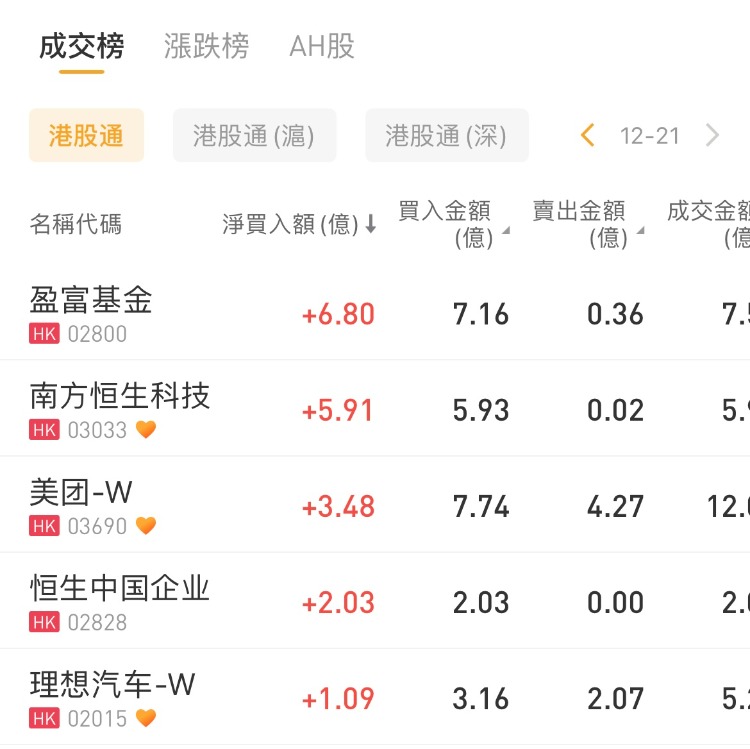 南下资金净买入盈富基金6.8亿港元,南方恒生科技、美团-W分别获净买入5.91亿港元、3.48亿港元;腾讯控股遭抛售2.06亿港元,中国海洋石油遭沽出1.34亿港元。