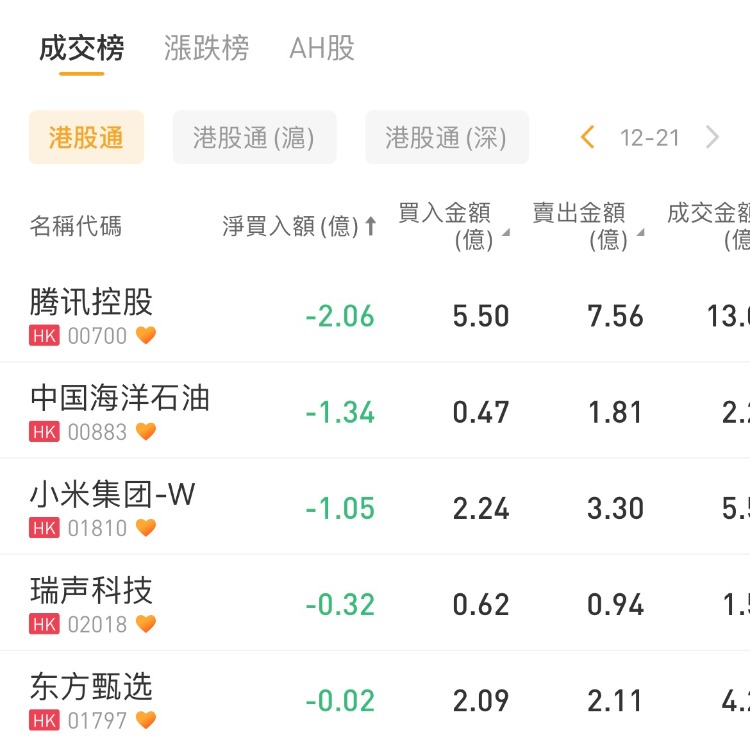 华盛资讯12月21日讯,南下资金今日净买入24.38亿港元。其中港股通(沪)净买入14.61亿港元,港股通(深)净买入9.76亿港元。