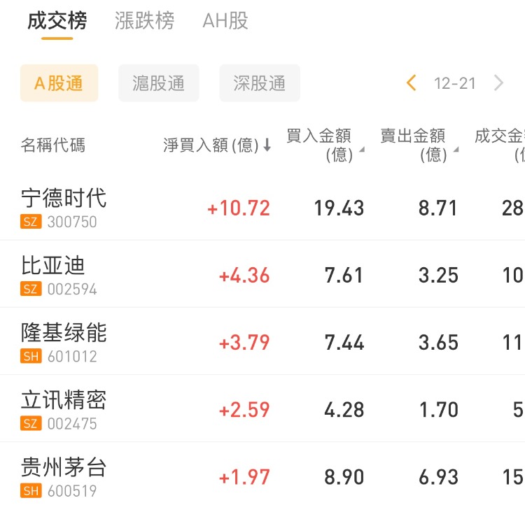 北向资金今日净买入12.03亿元。宁德时代、比亚迪、隆基绿能分别获净买入10.72亿元、4.36亿元、3.79亿元。长安汽车净卖出额居首,金额为3.66亿元。
