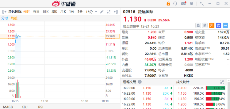截至发稿,跨境电商物流龙头泛远国际涨25.56%,中签一手浮盈920港元,最新总市值8.814亿港元;该股预计将于12月22日正式挂牌上市。