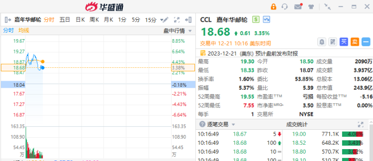 嘉年华邮轮绩后涨超3%,Q4营收同比增长约41%超预期,且亏损收窄。CEO表示,预订势头仍在发展,公司正在成功地推动价格上涨。