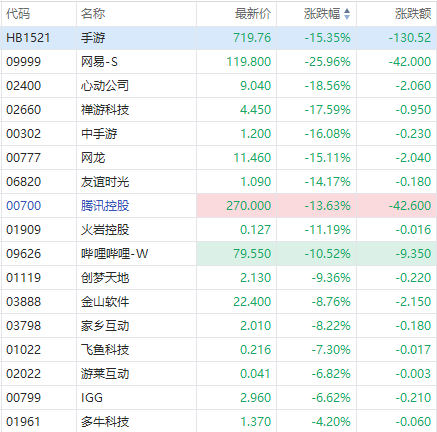 今日一则消息引发网络游戏概念港股跳水。网易-S(09999.HK)、腾讯控股(00700.HK)、哔哩哔哩-W(09626.HK)分别下跌25.96%、13.63%、10.52%。跌幅超10%的网游概念港股数量近10只。