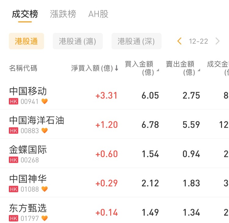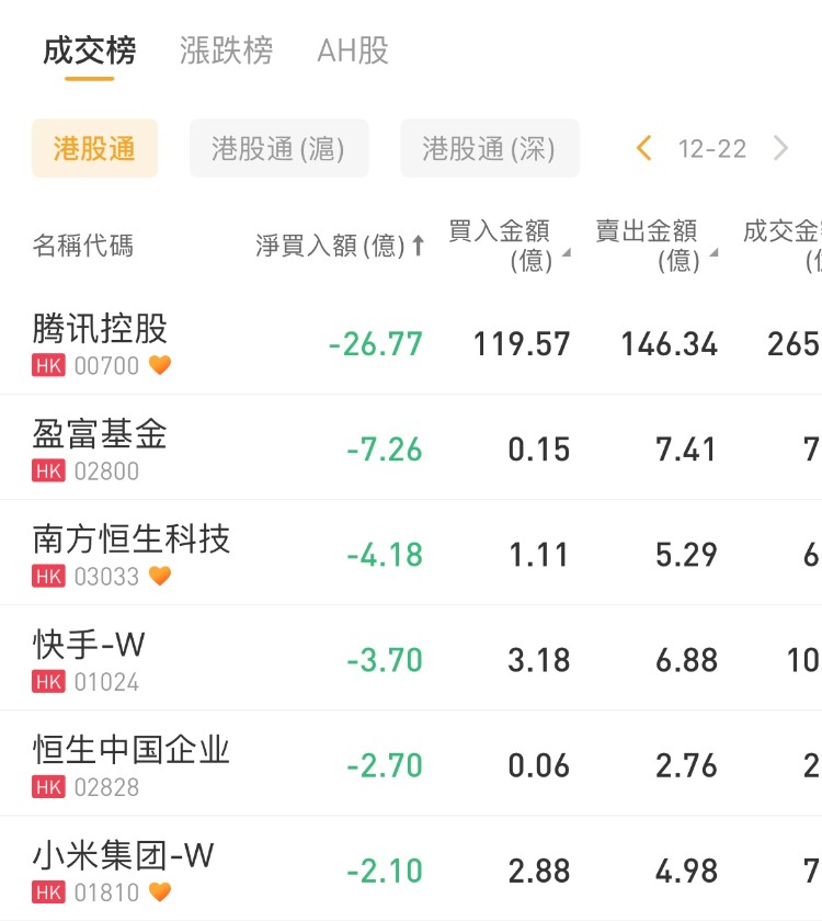 南下资金净买入中国移动3.31亿港元,中国海洋石油、金蝶国际分别获净买入1.2亿港元、0.6亿港元;腾讯控股遭抛售26.77亿港元,盈富基金遭沽出7.26亿港元。