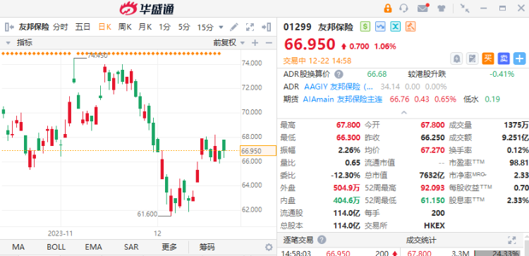 友邦沽19843,行使价54.75港元,2024年03月14日到期,实际杠杆12.3倍,2个月期以上产品最高杠杆之一