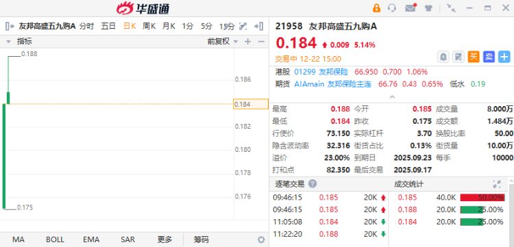 友邦购21958,行使价73.15港元,2025年09月23日到期,实际杠杆3.6倍,长年期、贴价