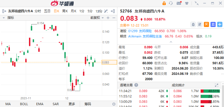 友邦牛52766 $52766.HK ,收回价60港元,行使价59.4港元,换股比率100,杠杆比率7.8倍
