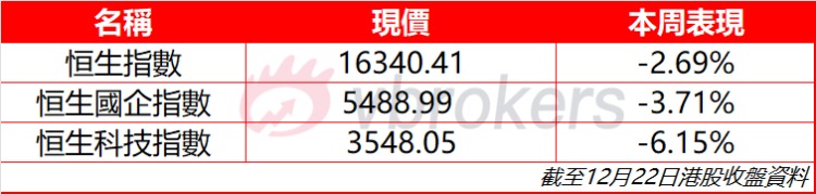 本周恒生指数跌2.69%,报16340.41点;恒生科技指数跌6.15%,报3548.05点;国企指数跌3.71%,报5488.99点。