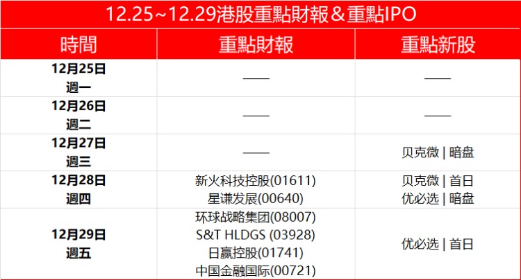 财报方面,12月28日,新火科技控股 $01611.HK 、星谦发展 $00640.HK 等发布财报;12月29日,环球战略集团 $08007.HK 、S&T HLDGS $03928.HK 、日赢控股 $01741.HK 、中国金融国际 $00721.HK 、皇冠环球集团 $00727.HK 、桦欣控股 $01657.HK 等发布财报。