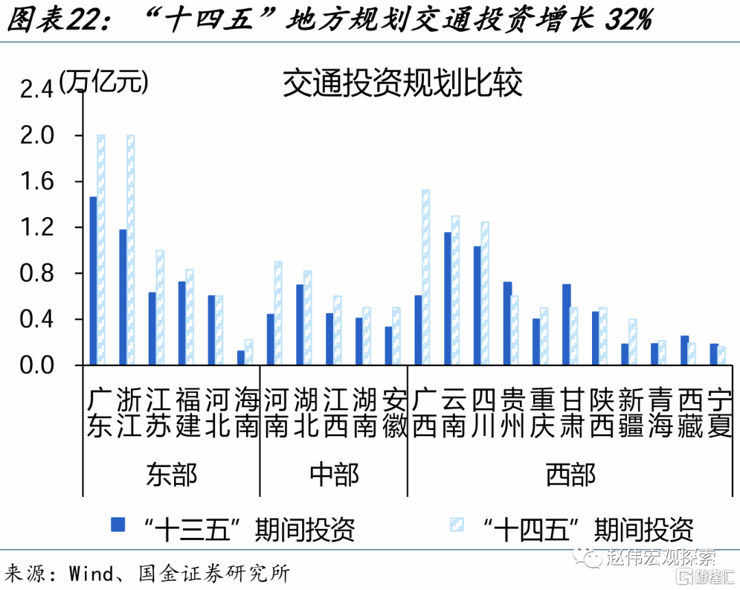 加快“十四五”项目建设或成推进实物工作量落地的关键,交通投资等仍有较强后劲。传统基建投资中,交通投资占比接近30%,是重要增长点。交通领域的“十四五”重大项目较多,还包含大量“新基建”工程。参考各地规划,“十四五”交通投资规划增长32%,对应交通投资未来两年平均增速可达10%以上,仍有较强后劲。