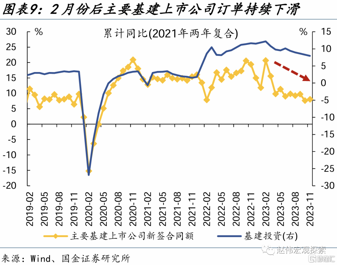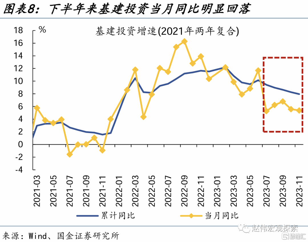 财政“蓄力”状态下,资金到位速度放慢,下半年来基建投资增速回落。2023年1-11月,广义财政支出增速-0.5%,明显低于年初预算的5.9%;其中基建相关公共财政支出在2022H2-2023H1连续负增,新增专项债发行进度也慢于去年同期。受此影响,今年下半年基建投资月均增速降至5.8%左右,明显低于上半年的10.1%。