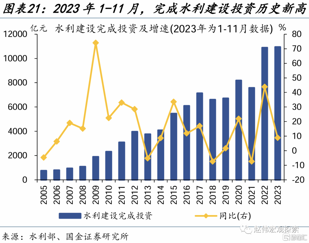 水利投资或在中央新增国债支持下明显增长,近期首批项目清单已落地。2023年1-11月,全国完成水利建设投资1.1万亿元、同比增长8.5%,完成投资为历史最多、已提前实现完成投资1万亿元以上的全年目标。“十四五”重点工程持续推进的基础上,近期万亿国债首批资金预算2379亿元下达,有望对水利投资形成明显拉动。