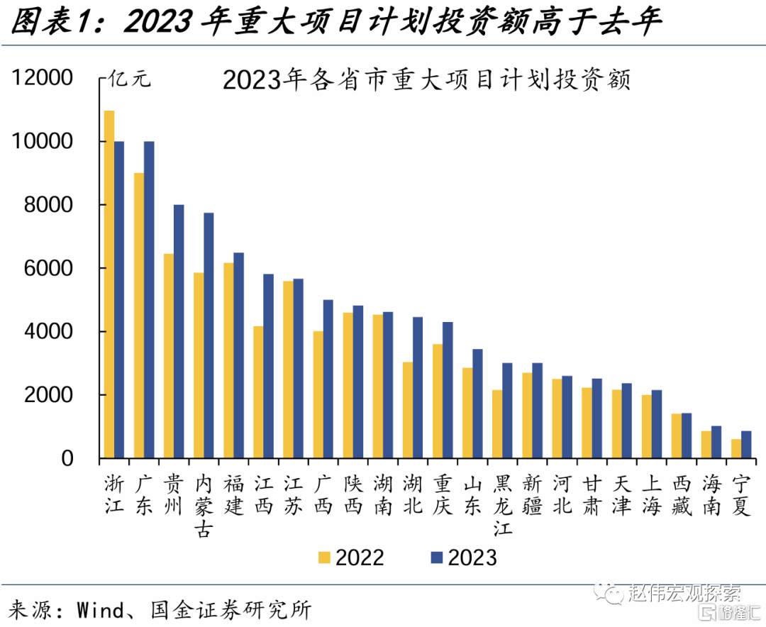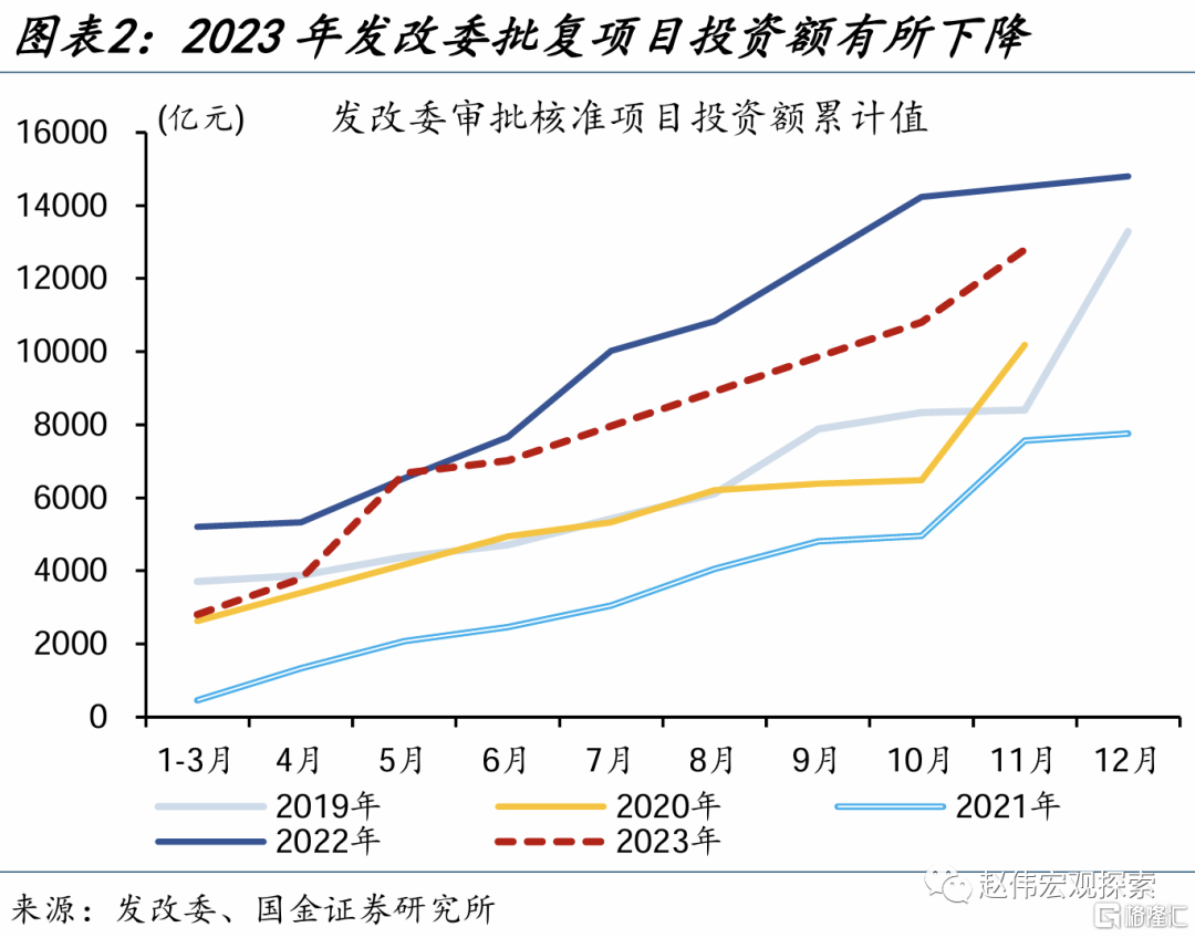 2023年重大项目计划投资额高于2022年;但受项目准备不足等影响,实际批复投资额有所下降。以23个主要省市为样本,2023年重大项目计划投资额合计接近10万亿元,较2022年增长13.6%。但在项目落地过程中,存在准备不足、难开工、进展慢等问题。多地2022年审计报告显示,项目准备不足等是重大项目难以推进的主要原因。2023年1-11月,发改委审批项目投资额1.28万亿元、同比下降约11.8%,各地月均重大项目开工投资额4.2万亿元、低于2022年同期的4.7万亿元。