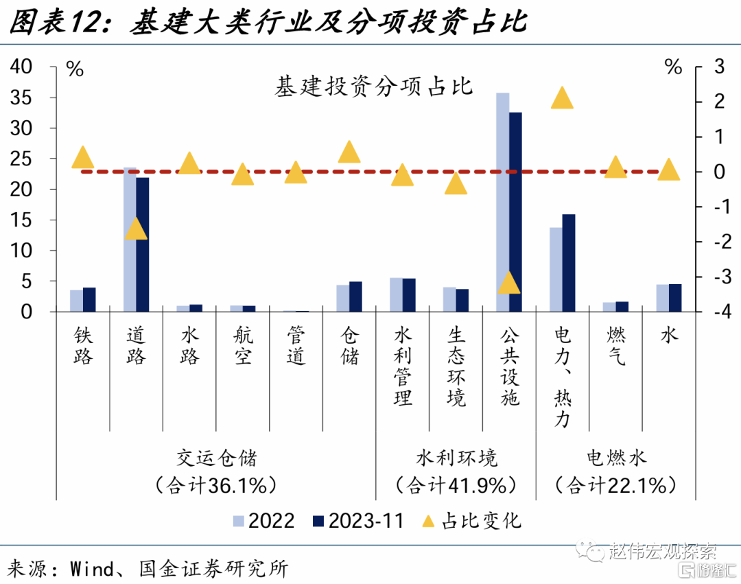 宽口径下,电燃水和交运仓储投资表现亮眼,水利环境投资明显下降。2023年1-11月,电燃水、交运仓储投资增速分别为24.4%、10.8%,在2022年高增速的基础上进一步抬升。细分领域中,电力热力、仓储、铁路投资明显扩张,增速分别较2022年提升4.2、3.6、19.7个百分点至28.5%、28.7%、21.5%,拉动作用较强。水利环境投资增速为-1.1%、较2022年大幅下降11.4个百分点,主要受公共设施投资拖累较大。公共设施在基建投资中占比最高、约33%,增速较2022年显著回落12.6个百分点至-2.5%。