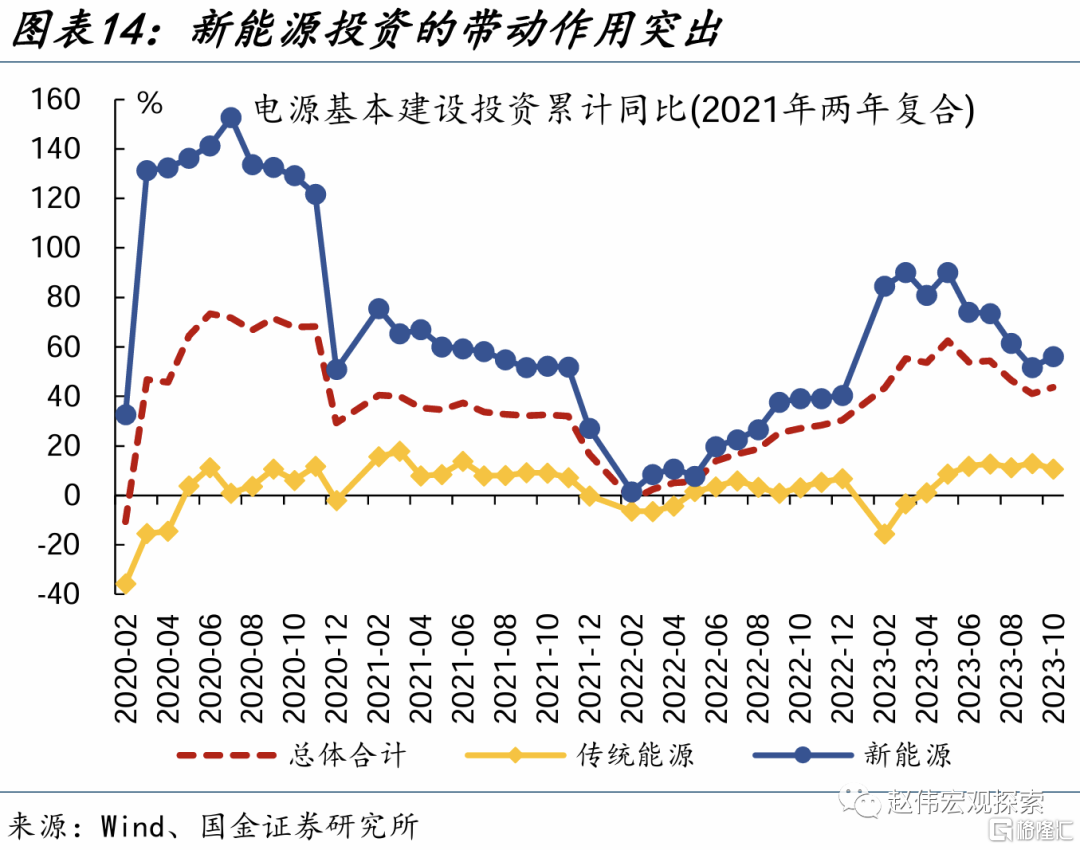 (2)宽口径下,电燃水和交运仓储投资表现亮眼,水利环境投资明显下降。电力热力投资保持高增,“新能源”、“新基建”等贡献较大。铁路投资显著增长,与“十四五”项目加快建设有关。公共设施投资回落,主要受专项债、卫生健康支出退坡等影响。