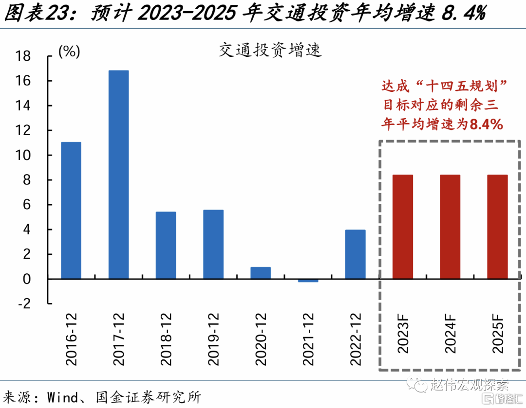 加快“十四五”项目建设或成推进实物工作量落地的关键,交通投资等仍有较强后劲。传统基建投资中,交通投资占比近30%,是拉动基建投资的重要增长点。交通领域的“十四五”重大项目较多,此外还包含智慧交通建设、交通信息设施等“新基建”工程,参考各地规划,“十四五”交通投资规划增长32%。2021、2022年交通投资增速分别为-0.2%、3.9%,2023年预计为3.5%,对应交通投资未来两年平均增速可达10%以上,仍有较强后劲。