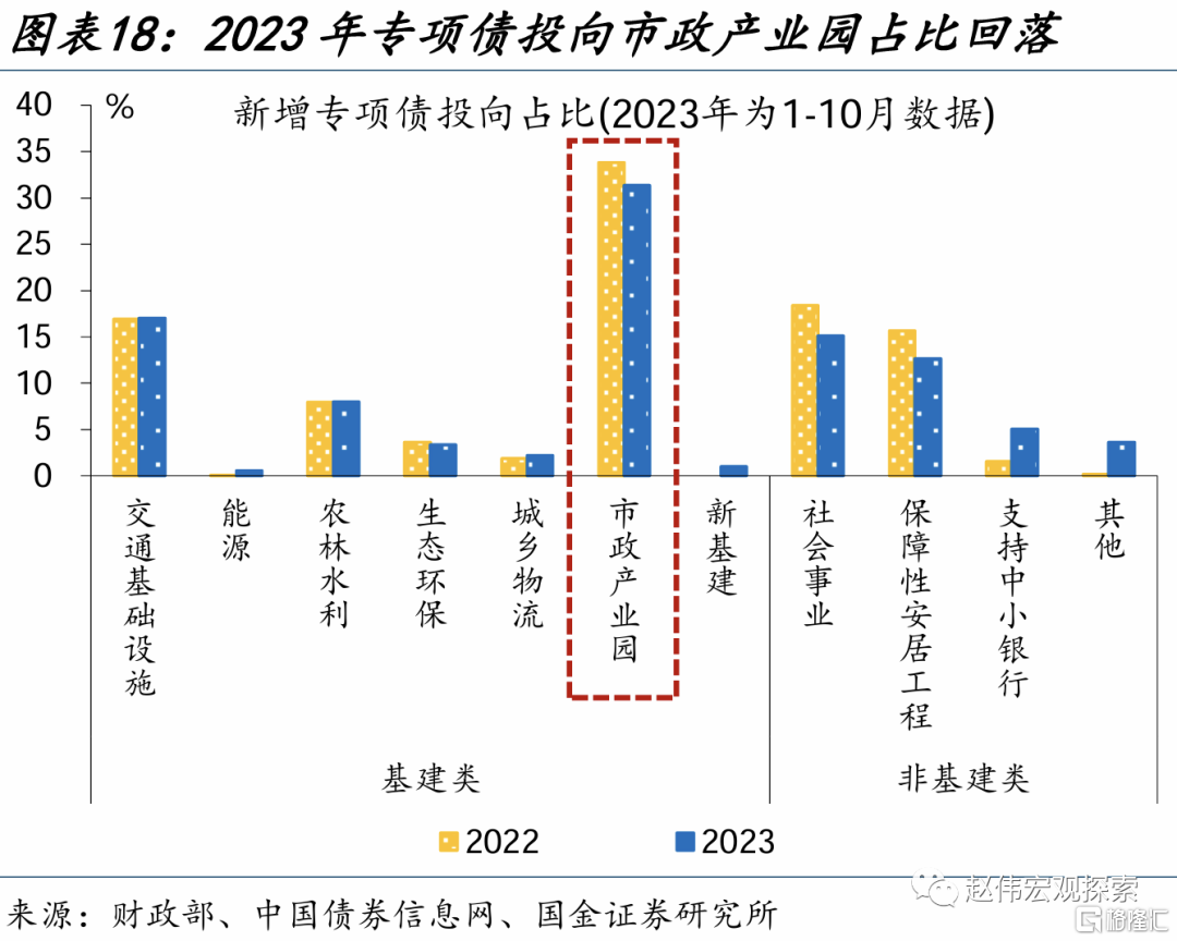 公共设施投资回落,主要受专项债、卫生健康支出退坡等影响。2023年,新增专项债限额及投向市政产业园比例均有下滑。2022年,公共财政卫生健康支出同比17.8%,与防疫支出增加等有关,相关资金多用于方舱医院、隔离点建设等,属于公共卫生基建范畴。随着疫情防控平稳转段,2023年前11月卫生健康支出同比大幅回落至1.4%。