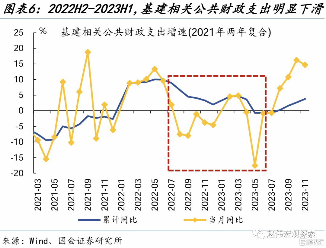 财政“蓄力”状态下,资金到位速度放慢,下半年来基建投资增速回落。 2023 年 1-1 1 月,广义财政支出增速 -0.5% ,明显低于年初预算的 5.9% 。其中基建相关公共财政支出一度下滑, 2022H2-2023H1 整体处于负增长区间;新增专项债发行进度也慢于去年同期,剔除 2022 年 10 月的 5000 亿结存限额来看,当年 6 月发行进度已达 90% ,今年 同期为 58.7% 。资金拨付到基建投资之间存在一定时滞,受前期资金到位速度放慢的影响,今年下半年基建投资当月同比降至 5 .8% 左右,明显低于上 半年的 10.1% 。