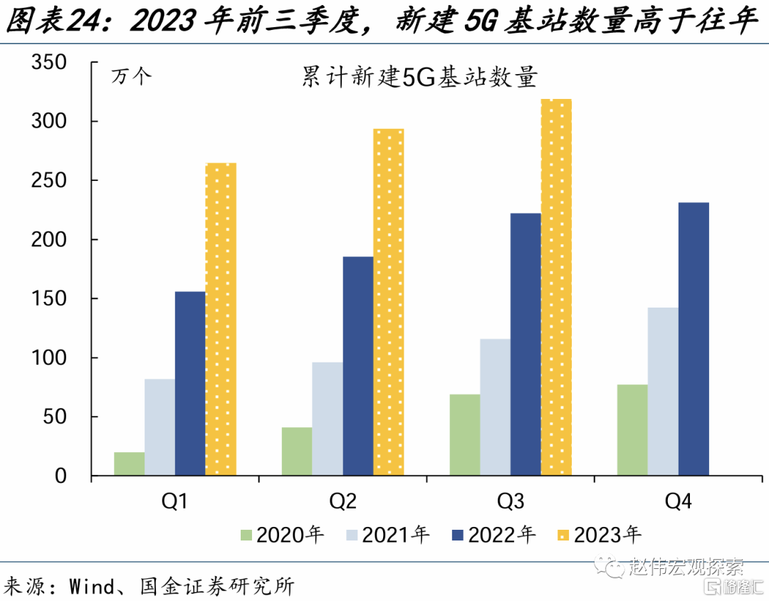 政策重点扶持下,“新能源”、“新基建”等投资仍有增长空间。2023年以来,5G基站、充电基础设施等新基建投资保持快速增长。2023年1-9月,我国充电基础设施数量为764.2万台、增量同比31.3%,新能源车保有量1821万辆,车桩比2.4:1,距离“2025年实现车桩比2:1、2030年实现1:1”的目标仍有较大差距,未来充电基础设施投资或将保持快速增长。此外,今年以来政策对于“新能源”、“新基建”领域的支持力度仍在加码,中央经济工作会议部署产业升级工作主线,发改委公布“数据要素”三年行动计划征求意见稿、提出数据产业年均增速超20%的发展目标。