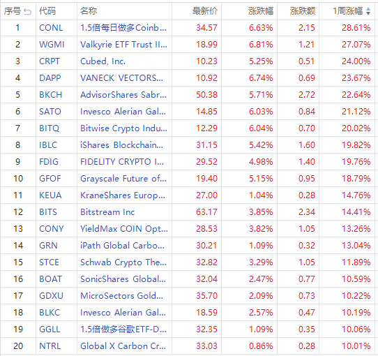 从美股ETF涨幅榜来看,收益加密货币多日连涨,带动Coinbase本周上涨18%,1.5倍每日做多coinbase $CONL 周涨28.61%。另外,谷歌本周累涨近7%,其挂钩ETF1.5倍做多谷歌ETF $GGLL 累涨超10%。