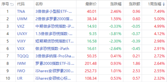 指数ETF方面,本周做多小盘股与做多恐慌指数ETF领跑,3倍做多小型股ETF $TNA 周涨超7.49%,2倍做多罗素2000指数 $UWM 周涨5%,1.5倍做多恐慌指数 $UVXY 周涨4.12%。另外,纳指本周上涨,其3倍做多纳指 $TQQQ 累涨超2%。