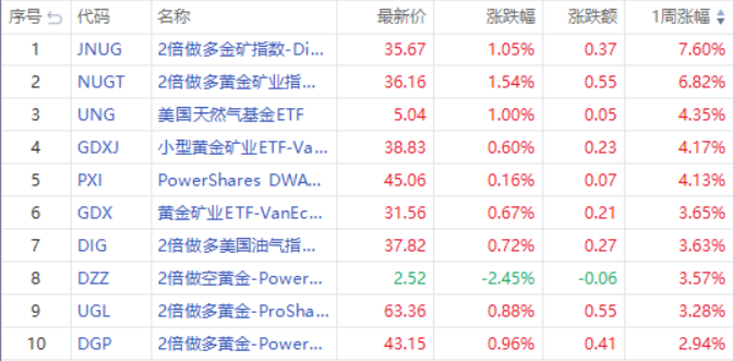 大宗商品ETF方面,2倍做多金矿指数 $JNUG 周涨7.6%,2倍做多黄金矿业指数 $NUGT 周涨6.82%,小型黄金矿业ETF $GDXJ 周涨超4%。