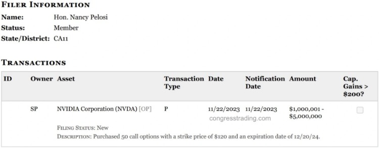 报道,美国众议院第52任议长佩洛西于11月以120美元的行权价购买了50份英伟达$NVDA 看涨期权(Call),到期日是2024年12月20日。信披文件显示,这笔交易的价值大概在100万-500万美元之间。然而今年7月,佩洛西还曾清仓了英伟达的股票,当时众议院正在考虑为美国半导体行业提供补贴和税收抵免。此外,佩洛西的丈夫Paul Pelosi是一位风险投资家,也曾交易过英伟达股票。