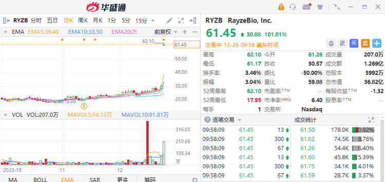 放射性药物治疗公司RayzeBio(RYZB.US)美股盘前暴涨近100%,报61美元。消息面上,百时美施贵宝将以每股62.5美元(较上周五的收盘价30.57美元溢价104%)的现金收购RayzeBio,以加强其抗癌药物业务。交易价值约41亿美元。