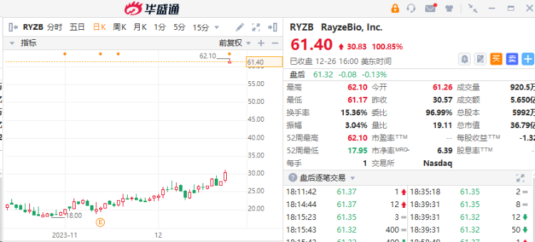 协议显示,BMS将以每股62.50美元的价格收购RayzeBio,交易总价值约41亿美元。截至发稿,在纳斯达克上市的RayzeBio股价翻倍,现报每股61.35美元,较上周五的收盘价上涨逾100%。