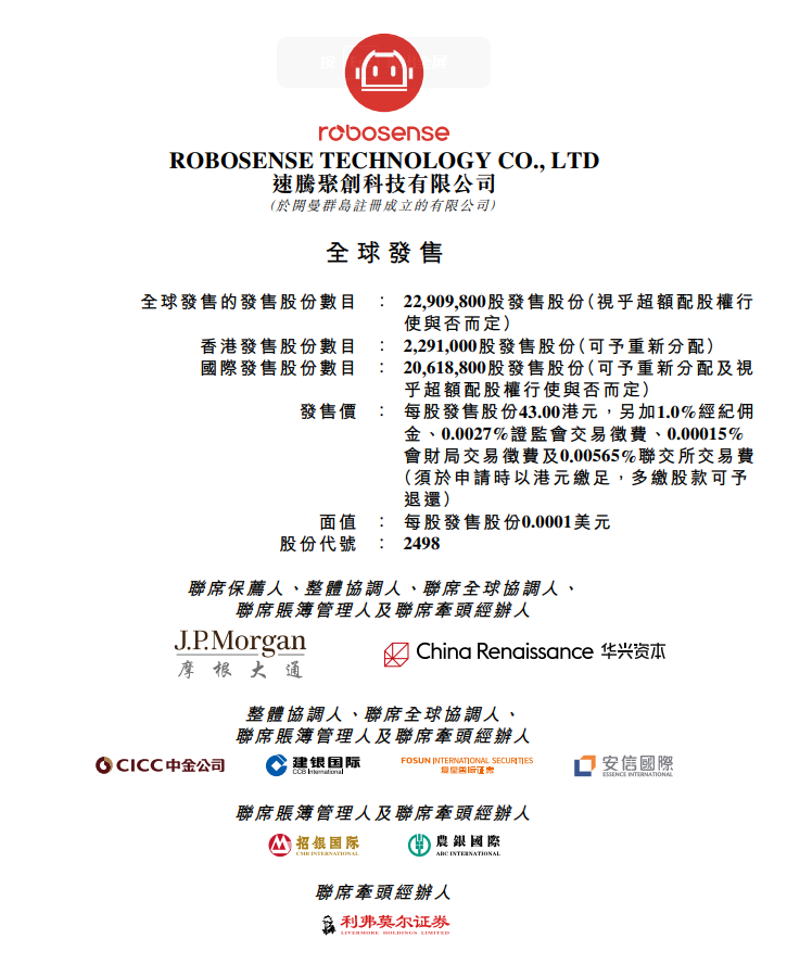 华盛资讯12月27日消息,速腾聚创 $02498.HK 于2023年12月27日-2024年1月2日招股,拟全球发售2290.98万股。发售价将为每股发售股份43.00港元。每手100股,预期股份将于2024年1月5日上市。前往新股中心,申购新股>>