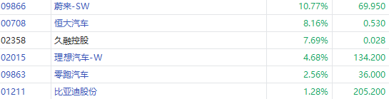 新能源汽车股早盘集体飙升,蔚来-SW涨超10%,消息面上,旗舰ET9发布并开始预售,CEO指订单量远高于官方预期。恒大汽车涨超8%,消息面上,恒驰汽车年终冲刺购车钜惠:10000定金可抵20000元;理想汽车-W涨近5%,消息面上,理想宣布,汽车周销量达1.21万辆,持续向5万辆月销目标发起冲击。
