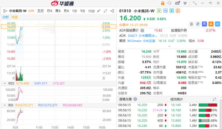 此外,小米汽车即将在12月28日举行技术发布会,并将公布小米汽车的技术。在工信部减免车辆购置税的新能源汽车车型目录中,两款小米牌纯电动轿车在列,型号为SU7和SU7 Max。小米集团创始人、董事长雷军表示,小米汽车定价有点贵,但是有理由的贵。截至发稿,小米集团-W涨超3%,暂成交3.96亿港元。